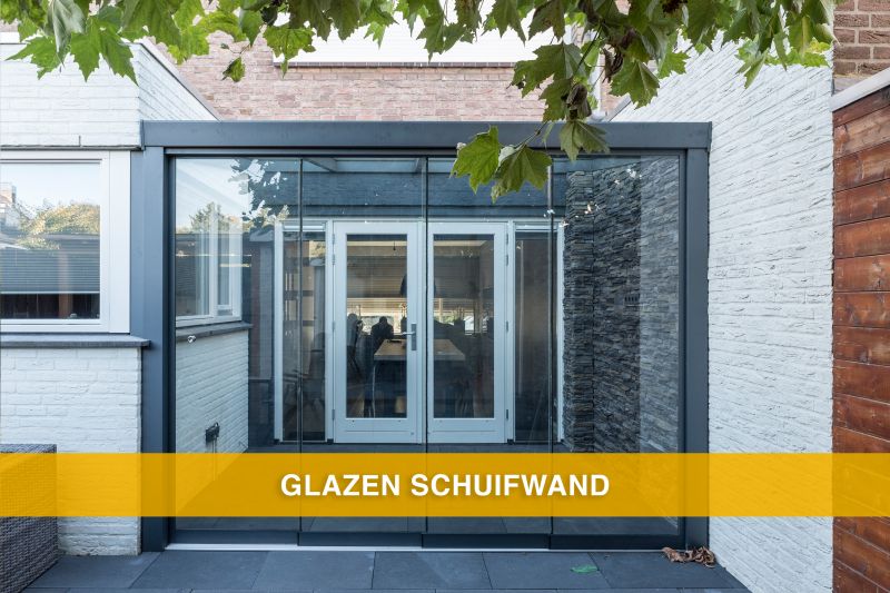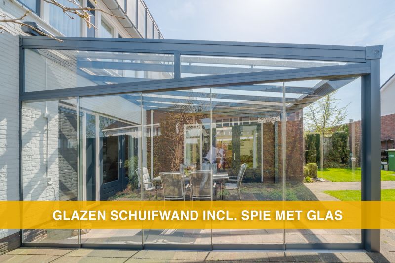Wilt u een glazen schuifwand onder de zijkant van de veranda? Kies dan voor een glazen schuifwand met spie. Omdat de zijkant afloopt moet er een spie onder om het gat te vullen tussen de glazen schuifwand en de veranda. Wilt u een glazen schuifwand onder de voorzijde? Kies dan een glazen schuifwand zonder spie.
